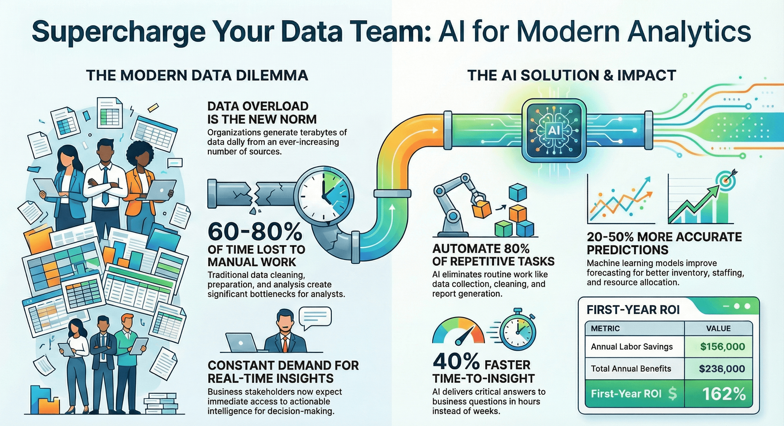 AI and automation address these challenges by augmenting human capabilities, automating repetitive tasks, and enabling data teams to focus on high-value strategic analysis.