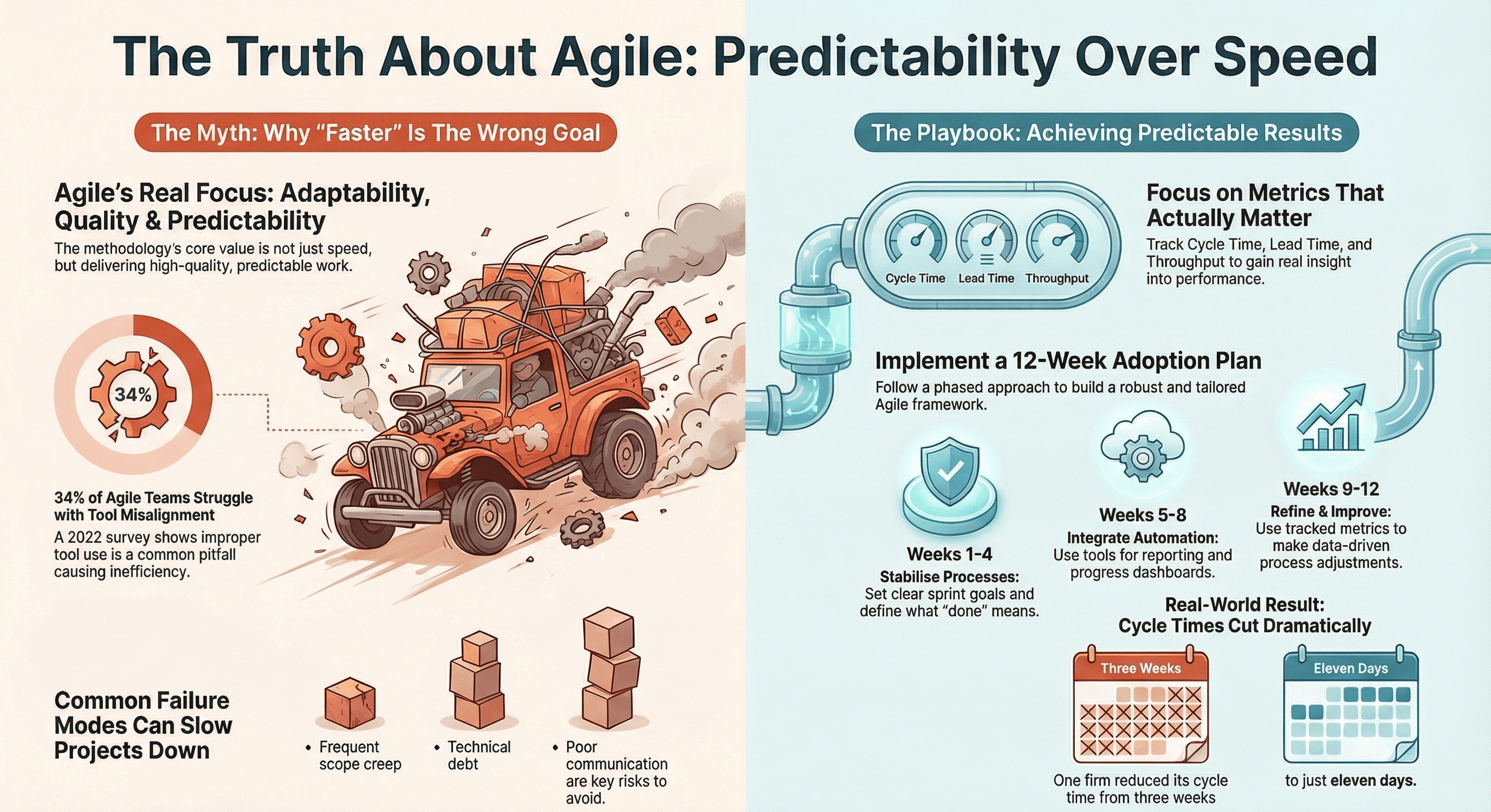 Agile methodology is often misunderstood as a guarantee for faster project delivery. However, the real value of Agile lies in its capacity to enhance adaptability, improve quality, and ensure predictability, rather than merely accelerate velocity. Many business leaders assume that adopting Agile will automatically speed up their projects due to widespread agile misconceptions. In this blog, we'll explore why Agile isn't synonymous with speed and provide a pragmatic playbook, tailored for SMBs, to achieve measurable improvements in their processes.